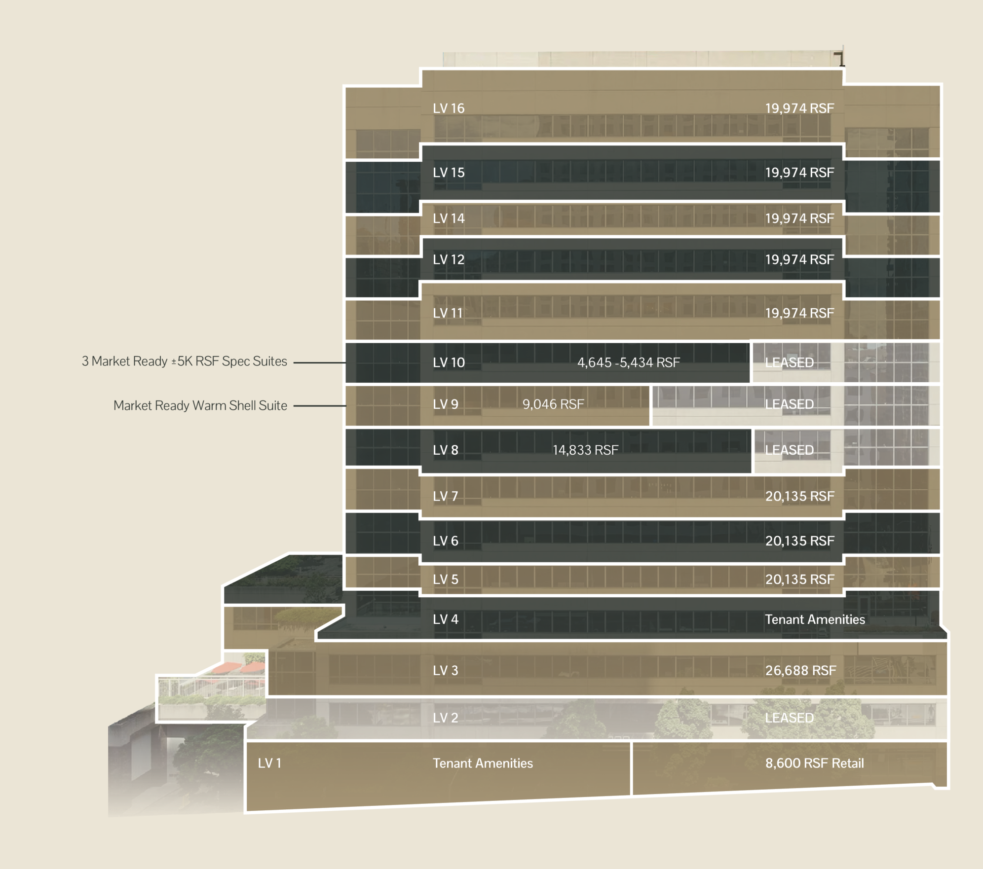 For tenants looking for move-in ready space or the ability to customize floors, LKWP will immediately offer the following:- Six move-in ready spec suites ranging from 5,000 SF (quarter floor) to 10,000 SF (half floor).- 20,000 SF top floor space delivered in vanilla box condition.