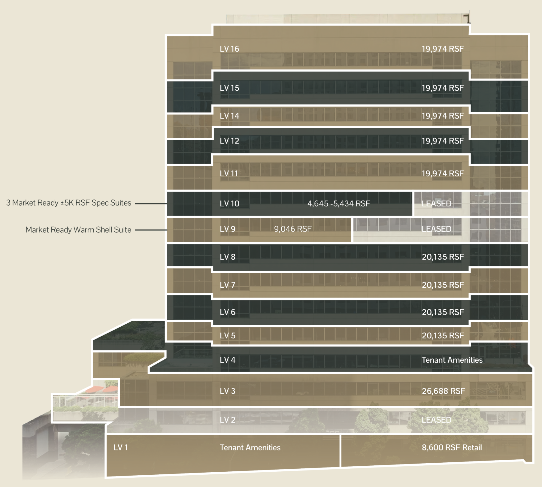 For tenants looking for move-in ready space or the ability to customize floors, LKWP will immediately offer the following:- Six move-in ready spec suites ranging from 5,000 SF (quarter floor) to 10,000 SF (half floor).- 20,000 SF top floor space delivered in vanilla box condition.